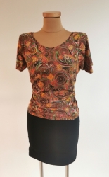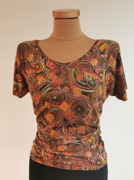 Tričko se spadeným rukávem je ušito z kvalitního elastického úpletu s krásným vzorem.